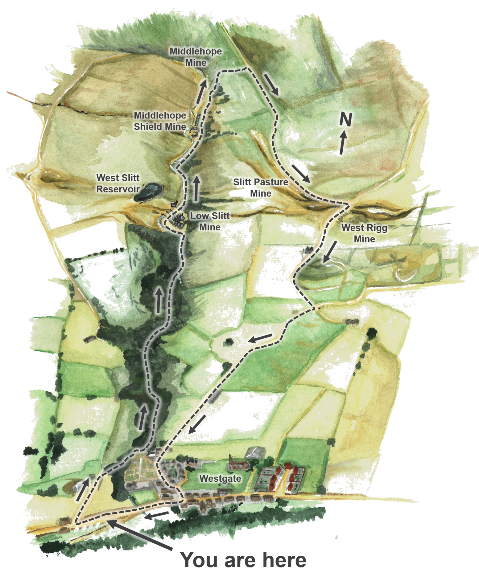 An interesting and varied 3.5 mile walk through Whitesike and Bentyfield mines and up onto the fell between the South Tyne and Nent valleys.