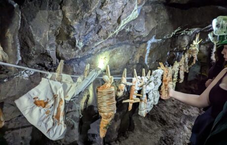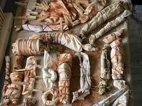 The group are examining the effects of lead mining on the miners’ clothing by visiting Nenthead Mines. Material was prepared by folding, bundling, tying and pegging organic calico and other materials together with bark, rusty metal items, bark, pine cones or leaves, and dribbling or dipping in tea, coffee, and rust-coloured silk dye. The items will be left for two months to see how it is affected by the environmental conditions in the mine. The effects of tallow candles on clothing will also be explored, and the fabric, along with re-imaginations of the miner’s shirt, will be used to produce a contemporary art installation.