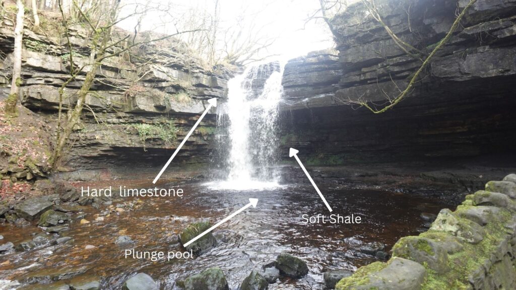 We spent the first day creating a walk for Naturefest. More information on this can be found in Malachi’s post. I’d like to focus more on the waterfall we visited while designing this trail. Summerhill Force (found near Bowlees) is to my mind interesting for two reasons. Firstly it shows really well how the waterfall formed. I’ve labelled the layer of shale that erodes back forming an overhang. Right up to the point where the limestone crashes down into the plunge pool below. Secondly there is a story attached to it, according to the tale an outlaw called Gibson hit behind the waterfall while running from the law. While people from the village brought him food. I certainly wouldn’t recommend living in ‘Gibsons Cave’, but it’s a good story none the less.