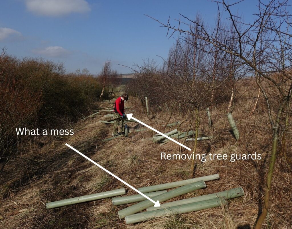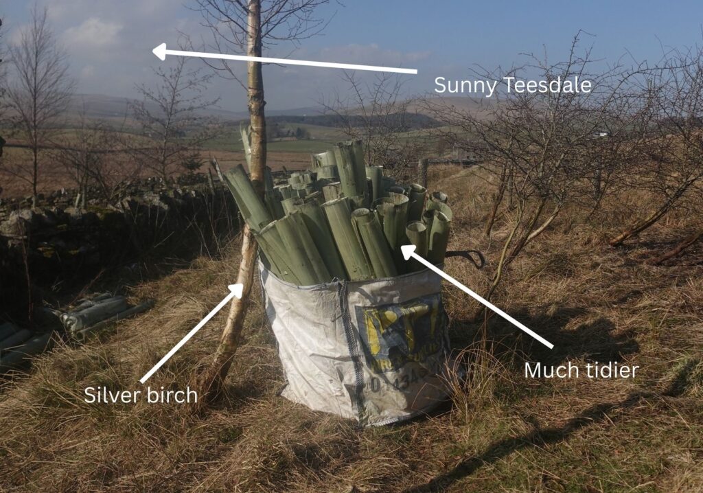 On the third day we moved away from Bowlees and further up into Teesdale, removing tree guards found up there. We worked out way down the hedge of spiky hawthorn bushes before realising the mess we’d made behind us! A lunch break up among the lapwings helped to ready us for an afternoon of crawling through prickles to clear up.